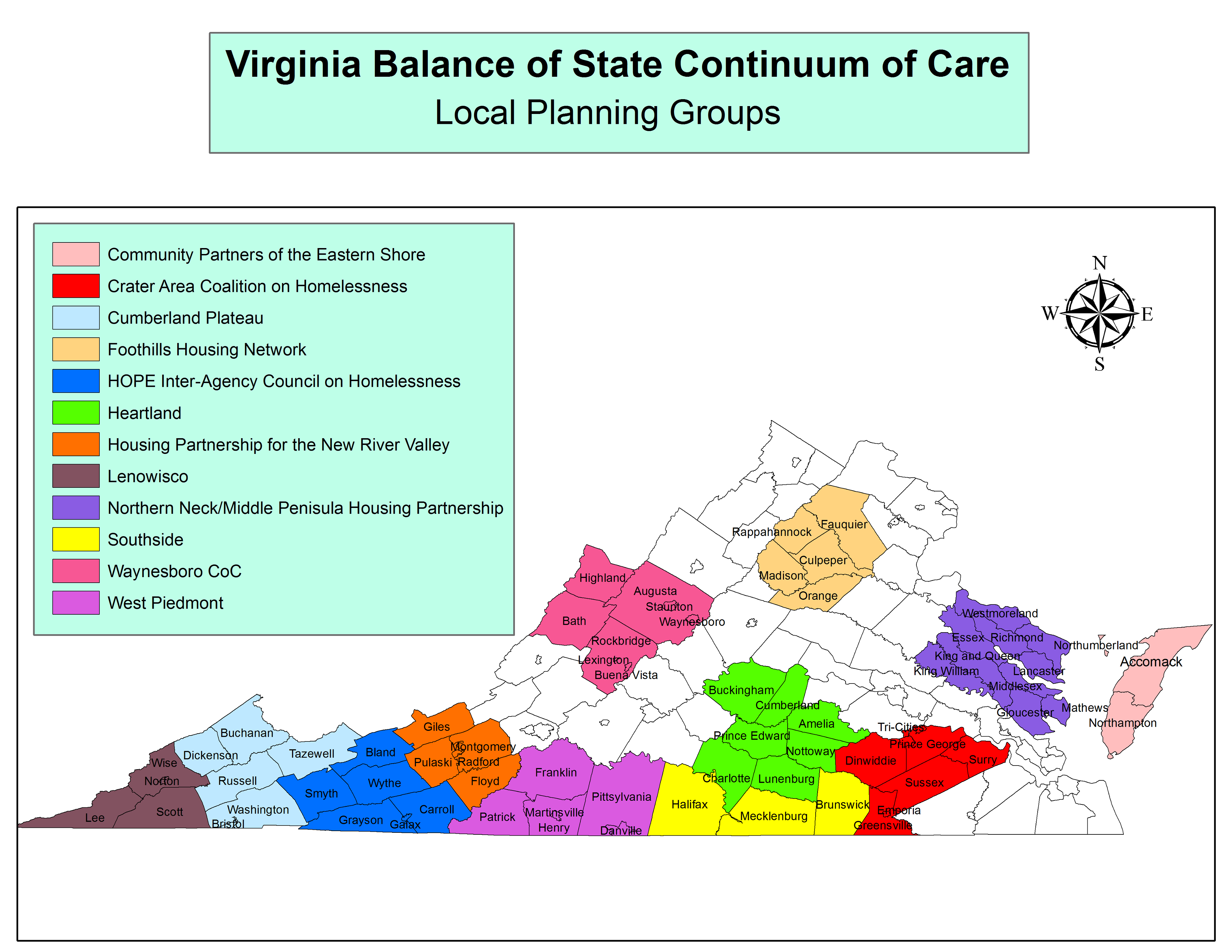 En 2021, el Balance of State de Virginia fue seleccionado para participar en el Programa de Demostración de Jóvenes sin Hogar (YHDP). El programa es una iniciativa federal para apoyar a comunidades seleccionadas a medida que desarrollan e implementan un enfoque comunitario coordinado para prevenir y poner fin a la falta de vivienda de los jóvenes. El Balance of State de Virginia se enfoca en la administración de YHDP en el grupo de planificación local Crater Area Coalition on Homelessness (CACH).
