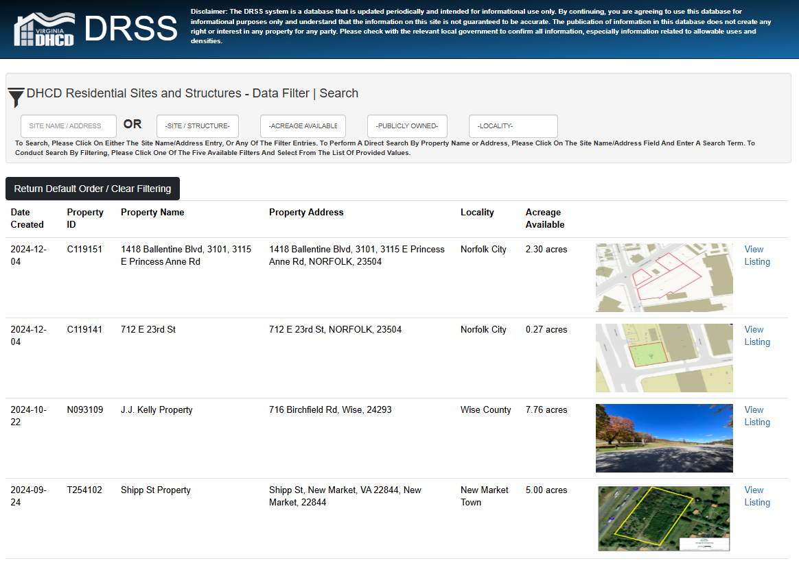 La Base de datos de Estructuras y Sitios Residenciales del Departamento de Vivienda y Desarrollo Comunitario de Virginia (DHCD) (conocida como DRSS) es una herramienta de marketing para que los gobiernos locales anuncien sitios y estructuras adecuados para futuros desarrollos o remodelaciones residenciales o de uso mixto. Las propiedades enumeradas en la base de datos son presentadas por los gobiernos locales y pueden ser de propiedad pública o privada, siempre que el gobierno local respectivo apoye la propiedad que se está desarrollando para el desarrollo residencial o de uso mixto.
